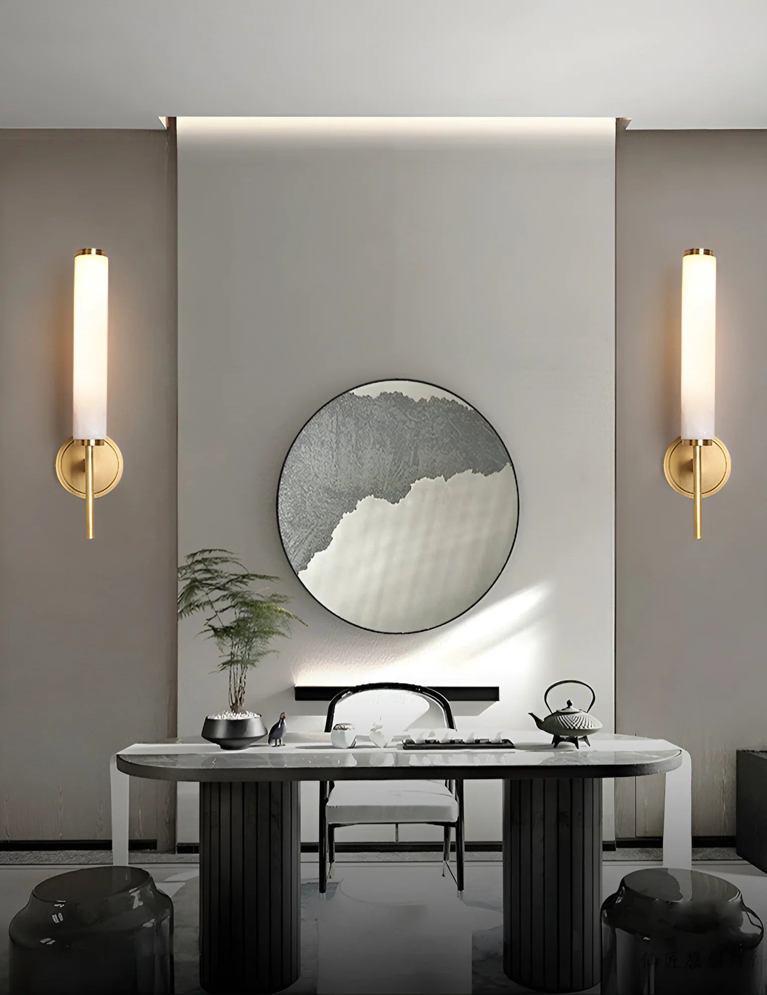 Brindisi Alabaster Candle Style Wall Lamp, Introduce a touch of elegance with the timeless design. The brass finish adds a touch of class while the alabaster shade balances light and shadow. Emitting a warm and inviting light, this wall sconce is perfect for any room, creating a cozy atmosphere.
