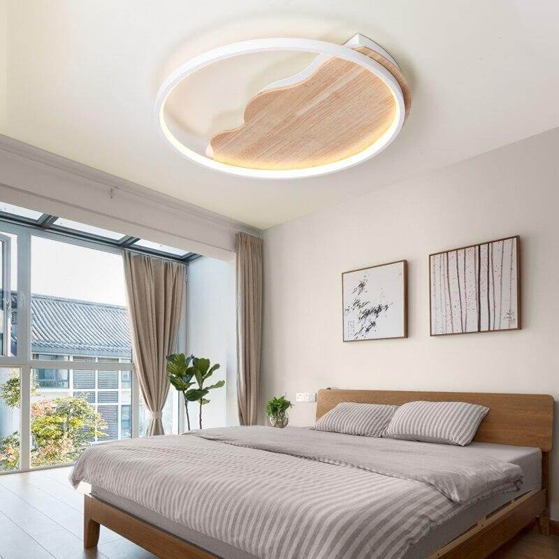 This distinctive light is sure to become a focal point of any room, with its circular LED powered light, accented by a crescent interior. This fixture is providing elements of nature, while approaching a more modern and neutral look, sure to compliment any room. Features a convenient remote control for easy use.