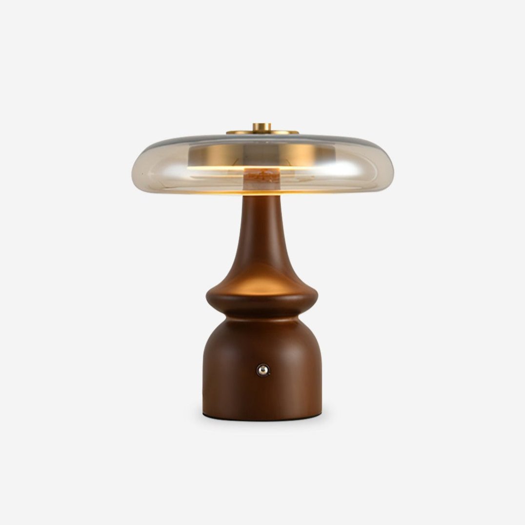 Elevate any space with the melding of vintage charm and modern elegance in the Nova Table Lamp. Its smooth walnut base and unique translucent glass shade emit a warm. inviting glow. The distinctive mushroom silhouette and luxurious metallic tones make it a captivating accent for any contemporary or classic décor.